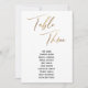 Dieses schlichte, elegante Design zeichnet sich durch den "Table Three" aus, der in einem modernen Schriftart in Handschrift dargestellt und mit einem Imitat-Metallic-Goldenen Effekt geschmückt ist. Der Schriftart für Namen kann auf Wunsch geändert werden. Wie auch die Hintergrundfarbe. Die Details werden sowohl vorne als auch hinten angezeigt. 151 //