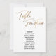 Dieses schlichte, elegante Design mit "Table Fourteen", in einem modernen Schriftart in Handschrift dargestellt und mit einem Imitat-Metallic-Goldeffekt geschmückt. Der Schriftart für Namen kann auf Wunsch geändert werden. Wie auch die Hintergrundfarbe. Die Details werden sowohl vorne als auch hinten angezeigt. 151 //