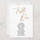Dieses schlichte, elegante Design zeichnet sich durch den "Table One" aus, der in einem modernen Schriftart in Handschrift dargestellt und mit einem Imitat-Metallic-Goldeffekt geschmückt ist. Der Schriftart für Namen kann auf Wunsch geändert werden. Wie auch die Hintergrundfarbe. Die Details werden sowohl vorne als auch hinten angezeigt. 151 //