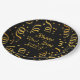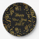 Silvesterabend-Teller in Schwarz und Gold mit kundenspezifischer Formulierung in der Mitte. Wählen Sie runde oder quadratische Teller in zwei Größen. Der Text in der Mitte ist festlich und Wirbel und enthält das neue Jahr. Confetti und Streamer fallen in goldenen Farben herum.