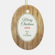 Auf diesem Ornament umgibt ein Holzrahmen aus warmen goldenen Imitaten Ihr eigenes Foto. Der Boden des Fotos wird von einem hübschen immergrünen Bouquet mit roter Birne geschmückt. Eine dünne grüne Linie trennt den Rand des Fotos vom Holzhintergrund. Die Rückseite des Ornaments hat den gleichen Holzrahmen mit einem leeren Interieur für Ihren eigenen Text in rot und dunkelgrün. Gut als Familiengeschenk, besonders für Großeltern und andere Familienmitglieder.