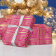 Dekoratives und elegantes Geschenkpapier in heißen Rosa und Gold mit glänzenden goldenen Quadraten, die eng miteinander verbunden sind, um eine faszinierende 3D-Illusion zu erzeugen.