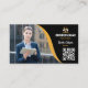 Make a powerful statement in the real estate market with this elegantly designed business card. The front of the card features a professional photo of a realtor, exuding confidence and approachability. The back boasts a chic gold house logo accompanied by construction tools, symbolizing home building and expertise. Integrated QR code technology provides a seamless way for clients to reach you. This business card is ideal for real estate agents who want to combine personal branding with effective digital connectivity.