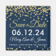 Elegantes Hochzeitsdesign "Save the Date" mit Gold Imitate Glitzer Confetti Navy Blue, und individuelle Namen und Datum Text.