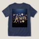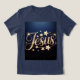 This t-shirt features a design of Jesus in starry gold script against a deep navy blue background. The text is rendered in metallic gold with a glittery, sparkly effect that gives it a luxurious, celestial appearance. The lettering has flowing curves and decorative flourishes. Around the text are several golden stars of varying sizes, each with a bright sparkly effect. The stars are above and below the text. The composition has a symmetrical layout with the text centered and the stars creating a balanced decorative pattern. The women's t-shirt features a uniquely soft tri-blend fabric, modern feminine fit, scoop neck and short sleeves. The t-shirt is a navy blue color.