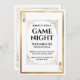 Diese Game Night Party Einladung zeichnet sich durch ein klassisches Kartendesign aus. Ein verzierter, Vintager Stilrahmen umgibt den mittleren Textbereich. Ein passender Rahmen für die Goldfolie grenzt an die Einladung. Zwei Golddiamanten und das King-Monogramm sind in gegenüberliegenden Ecken gedruckt, ähnlich dem Layout in einem Kartenstapel.