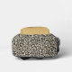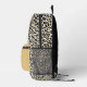 Dieser personalisierte Rucksack ist mit goldenen und schwarzen Leoparden-Flecken auf weißem Hintergrund gestaltet. Fügen Sie der Goldtasche ein Monogramm und einen Vornamen in modernem Schwarz-Weiß-Skript hinzu, mit dem vollständigen Namen unten in schwarzem Sans Serif-Schriftart. Ideal für den Rückweg zur Schule!