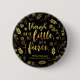 Ein Knopf mit dem Zitat von William Shakespeares A Midsommer Night’s Dream "Obwohl sie nur wenig ist, ist sie erbittert" umgeben von Blume und Blätter in Imitaten goldenen Folie vor schwarzem Hintergrund. *Bitte beachten Sie, dass das Zazzle-Wasserzeichen, das in der Zoomvorschau angezeigt wird, nicht auf dem gedruckten Endprodukt angezeigt wird. © Bookish and Wonderful