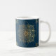 Ein wunderschönes goldenes Mandalas, das sich in ein verziertes Damastmuster wiederholt. Das Gold ist glänzend, um echte Goldfolie nachzuahmen. Die Mandalase sind mit aufwändigen, handgezeichneten Linienarbeiten entworfen und auf einem tiefmarineblau-Hintergrund platziert.