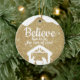 Gold Manger Baby Jesus Scripture Xmas Decor Ceramic Ornament: Embrace the magic of the season with this stunning, faith-inspired design! The front showcases a luxurious golden glitter background, complemented by a snow-cap. In pristine white, a touching holy nativity scene takes center stage, paired with the uplifting bible quote: "Believe Him To Be The Son of God." On the reverse, enjoy the identical enchanting backdrop featuring the cherished Faith Verse in customizable white text: "And this shall be a sign unto you; Ye shall find the babe wrapped in swaddling clothes, lying in a manger Luke 2:12" Tailor the wording for your personal devotion xmas decor, making it an ideal addition to your biblical holiday decorations, a thoughtful religious gift, or a symbol of enduring belief. Bring home the wonder—customize and buy your Christian keepsake on Zazzle right away for a truly blessed Christmas!