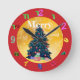 Genießen Sie den festlichen Geist mit dieser farbenfrohen Uhr mit Weihnachtsbaum, goldfarbenem und rotem Hintergrund und der Phrase "Fröhliche Weihnachten" in Weiß. Klare Hinduarabische Zahlen für einfaches Lesen.