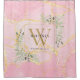 Eleganter personalisierter Duschvorhang in Aquarellfarben mit Blumengrün, Monogramm, mit einer goldenen Monogramm-Initiale auf einem rosa-agaten Geodehintergrund. Entwickelt von Thisisnotme©