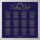 Dieses schöne 12-Tisch Hochzeitsstühle-Diagramm wird es Ihren Gästen erleichtern, ihre Sitzplätze am Empfang zu finden. Das Design ist schlicht und elegant mit Goldtext auf marineblarem Hintergrund und einer goldenen Imitat-Folie mit Vintager filigraner Filigranbindung.
