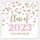Individuelle Name-Klasse von 2023 Abschluss Aufkleber mit goldfarbenem und rosa Konfetti-Muster mit modernem Schreibstil.