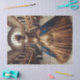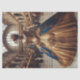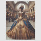 Stehend in einer Vintagen großen Halle oder vielleicht einem Vintagen Bahnhof, etwas außerhalb, strahlt diese Viktorianische Steampunkelegante Goldprinzessin blau und goldgelb mit Uhrwerk, die in ihr elegantes Fantasy-Kleid mit einzigartigem Gewebepapier eingewoben sind. Das ist perfekt für Kunsthandwerk wie DecoPage.