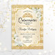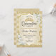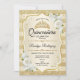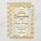 Gold weiße Quinceanera Feier Einladung. Enthält Streifen, Skript-Schriftart, Rosen, Tiara und Konfetti. Klassisches Design mit Imitaten Glitzer Gold. Ideal für eine elegante Glamour.