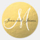 Gold Schwarze Gastgeschenk Hochzeit Aufkleber mit Braut- und Bräutigam-Namen und Monogramm-Nachname. Auch kann für Hochzeiten Einladung Umschlag Aufkleber verwendet werden. Vollständig anpassbar. Elke Clarke© für MonogramGallery bei Zazzle. Andere Farben in unserem Geschäft verfügbar. Druckte Foto-Effekt von Goldfolie im Hintergrund mit weißem Monogramm und schwarzem Skripttext. Ideal für ein Schwarz-Gold Hochzeitsthema.