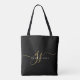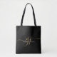Eine schicke, moderne, goldfarbene Monogramm auf schwarzem Totbeutel, mit einem dramatischen Skript, das mit Swashes beginnt und in einem modernen Serifentyp Ihren vollen Namen trägt.