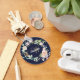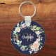 Hübscher Monogramm-Schlüsselanhänger mit einem schönen Skriptnamen, der einen Goldvorschuss enthält, der durch eine zarte Aquarellgarland mit blühender Rose auf marinebaublauem Hintergrund gerahmt ist. Personalisieren Sie sich, um ein besonderes Geschenk zu erhalten! Entwickelt von Thisisnotme©