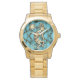 Dress up your outfit mit dieser einzigartigen "One of a Kind" Südwest Kokopelli Gold Watch! Es besitzt einen Gold und schwarzen Südwesten Kokopelli, der Flute spielt und unter der Sonne auf einem türkisfarbenen, schwarzen und goldenen Steinboden tanzt! Original Art Design von Künstler Kerry Miller.