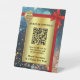 Feierlich glänzende Business-Tabletop-Vorlage mit rotem Band auf Gold. Einfache Anpassung mit Ihrem Firmenlogo, QR-Code und Texten. Ideal für einen Einzelhandel oder ein Hotel, das den Kunden die neuesten Weihnachtsrabatte zeigt.