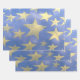 Dieses Packpapier zeichnet sich durch ein blau-goldfarbenes Sterndesign aus.