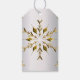 Ein festlicher Geschenktag mit einer metallischen Goldschneeflocke auf silberfarbenem Hintergrund. Die andere Seite ist absichtlich leer verlassen, damit du deinen Weihnachtsgruß darauf schreiben kannst.