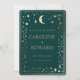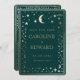 Forest Green Gold Celestial Save the Date Card mit QR Code - Diese Einladung ist keine echte Goldfolie - es ist ein digitales Design für diejenigen, die Downloads und nicht geprägten Druck bevorzugen. Dasselbe Produkt gibt es aber auch in unserer Kollektion mit realer Goldfolie für eine glänzende und geprägte Oberfläche. Mit dieser eleganten Save the Date-Karte verkünden Sie Ihre Hochzeit im himmlischen Stil. Mit einem tiefen, waldgrünen Hintergrund mit goldenem Mond, Sternen und grünen Details verbindet es zeitlosen Charme mit modernem Komfort. Auf der Rückseite befindet sich ein individualisierbarer QR-Code, der direkt auf Ihre Hochzeitswebsite verweist und den Gästen den Zugriff auf alle Details erleichtert. Bedrucktes Design, keine echte Folie.