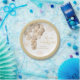 Dieses Design zeigt einen hübschen Bären mit Ballons und Aquarellwolken mit Imitaten goldenen Folienstars.