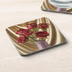 Dieser Untersetzer verfügt über ein digitales Foto von sechs rote Rosen, das in einer Lavendel-Keramik angeordnet ist und mit einer Metallvergoldung an den Blättern bespannt ist. Die Rose sind vollständig geblümt und in verschiedenen Winkeln positioniert, wodurch eine symmetrische Zusammensetzung entsteht. Die Vase ist schlank mit einem geschwungenen Hals und einer breiteren Basis, gefärbt in einem weichen Lavendelschatten. Der Hintergrund ist mit luxuriösem goldenen Seidenstoff mit dramatischen Falten und Falten ausgestattet, die einen reichen, drapierten Effekt erzeugen. Der Untersetzer ist ein harter Untersetzer aus Kunststoff mit Korkunterlage. Das Untersetzer Set umfasst sechs Untersetzer.