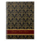 Sehr detailliertes goldenes Damast-Muster auf schwarzem Hintergrund. Niedrigere dekorative Bar für Ihren eigenen Text zu Ihrem eigenen Notebook hinzugefügt. Legen Sie Ihren Namen darauf oder ein beliebtes Sprichwort.