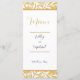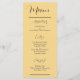 Eine elegante Gold und Black Wedding Reception Menu Karte, die mit einem goldfarbenen Stilstil auf weißem Hintergrund mit schwarzem Text wie: Braut- und Groomnamen und Hochzeitstag gestaltet wurde. Auf der Rückseite befindet sich der Text: Menü, Appetizer, Entre und Dessert Selection auf einem goldfarbenen Hintergrund. Um Ihre persönlichen Daten zu personalisieren, fügen Sie einfach Ihre Daten in unsere einfache Vorlage ein und ersetzen den Beispieltext. Vergewissern Sie sich, dass Sie die gesamte Hochzeitskollektion im Gold- und Black-Elegant-Stil sehen.