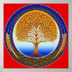 Der goldene Baum des Lebens auf zyanischem und rotem Hintergrund. Erstellt mit KI-Software.