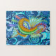 Ein schöner, goldfarbener und grüner Wasserdrache auf dem Hintergrund wirbelnder Wellen in Blau- und Türkistönen.