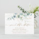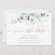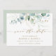 Diese Hochzeit speichern Sie das Datum Einladung mit gemalten Aquarellfarben Eukalyptus, botanisch grün und Gold Glitzer Blätter mit Gold-Skript.