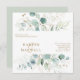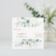 Diese viereckige Hochzeitseinladung enthält gemalte Aquarellfarben Eukalyptus, botanisch grüne und goldene Glitzer-Blätter mit Goldschrift.