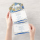 Ein wunderschönes tropisches Blau- und Goldblatt-Design in einer Hochzeitseinladung macht Ihre Hochzeitspläne so viel einfacher, als alle separaten Gehäuse einer regelmäßigen Einladung zu bestellen. Ein weißes und goldenes Mittelstück rundet Ihre Einladungs-Details ab