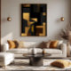 Dieses abstrakte Kunstwerk ist ein Dialog zwischen dem Luxus des Goldes und der Schattentiefe. Präzise Geometrien - Rechtecke, Dreiecke, Kurven - verflechten sich wie musikalische Noten und schaffen so einen visuellen Rhythmus, der das Auge dazu einlädt, jede Ebene zu erforschen. Goldene Farbtöne strahlen Raffinesse aus, während intensive Schwarze Dramen hinzufügen, was zu einem Stück führt, das Modernität und Zeitlosigkeit gleicht. Ideal für Räume, die Eleganz suchen, ohne auf die Persönlichkeit zu verzichten.