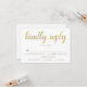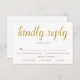 Diese elegante RSVP-Karte eignet sich perfekt für einen goldenen Jahrestag. Die weiße und goldene Antwortkarte enthält den Satz "Freundliche Antwort", geschrieben in schöner Goldkalligrafie. Passen Sie den unten stehenden Text mit Ihrem Antwortdatum und Ihren Essensentscheidungen an.
