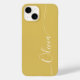 Gold White Elegant Calligraphy Script Custom Personalisiert Name iPhone 14 Smart Phone Cases zeichnen sich durch ein modernes und trendiges, einfaches und stilvolles Design aus, mit Ihrem personalisierten Namen in eleganter handgeschriebener Schrift Typografie auf einem goldenen Hintergrund. Entworfen von ©Evco Studio www.zazzle.com/store/evcostudio