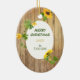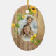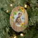 Hier ist ein sonniges und helles Vorlagendekor, das fröhlich ist, aber das traditionelle Glitz, Rot und Grün der meisten Ornamente aufgibt. Ein warmes vergoldetes Imitat mit Holzrahmen, das mit hellen Sonnenblumen und grünen Blätter geschmückt ist, umgibt Ihr Foto. Die Rückseite des Ornaments hat den gleichen Holzrahmen und Sonnenblumen, mit einem leeren Interieur für Ihren eigenen Text in dunkelgrün. Als Familiengeschenk, besonders für Großeltern und andere Familienmitglieder, und kann leicht das ganze Jahr über ausgestellt werden. Ändern Sie den Gruß auf der Rückseite, um zu jedem Anlass passen!