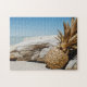 Erhellen Sie Ihren Tag mit sonnigen Strand-Schwingungen. Goldananas, die auf dem Strand ein Sonnenbad nimmt.