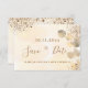 Eine trendige und mädchenhafte Save the Date-Karte für eine 40. Geburtstagsfeier (oder jedes Alter). Ein goldfarbener Hintergrund mit goldenem Eukalyptusblättern und Imitaten goldener Glitzer Staub. Personalisieren und fügen Sie Datum, Namen und Text. Goldene Buchstaben. Der Text: Save the Date ist mit einem großen angesagten, handgeschriebenen Stilskript geschrieben.