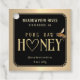 Einfache und dramatische Honigmarke mit goldenem Farbverlauf und einer fliegenden Honigbiene auf schwarzem Hintergrund. Ein goldenes Herz ersetzt den Buchstaben "O" im Wort HONEY. Fügen Sie Ihren benutzerdefinierten Text auf der Rückseite ein.