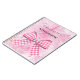 Ein mädchenhaftes Notizbuch für Schule, Journalismus oder Tagebuch. Rosa Flüssigkeiten mit goldenem Splash als Hintergrund, verziert mit einem großen karierten Bogen. Personalisieren und einen Namen hinzufügen.