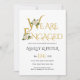 Goldene dekorative Typografie und weiße Rose Engagement Party Einladung. Dieses elegante Hochzeitsdesign zeigt den Text "We are verlobt" in eleganter dekorativer Goldtypografie und Weißrosen. Die Rückseite ist in massivem Gold gehalten.