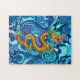 Ein chinesischer Drache im goldenen Stil auf dem Hintergrund wirbelnder Wellen in Blau- und Türkistönen.