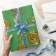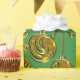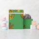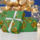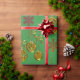 Diese grüne und goldene Weihnachtspackung hat ein Muster aus goldenen Weihnachtsbaumbaumen und roten und orangefarbenen Schneeflocken auf festlichem grünem Hintergrund.
