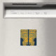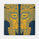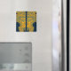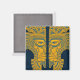 Ein Paar von Azteken inspiriert Masken stehen einander gegenüber, was das Aussehen einer dritten Maske schafft, die nach vorn schaut. Die komplizierten Linien und Kreise werden in einer goldgelben Farbe bemalt, die hervorgehoben wird, um einen subtilen Glanz auf der Oberfläche zu erzeugen. Das Interieur und der Hintergrund des Bildes sind mit tiefblauen Farbtönen vollendet, die in der Mitte des Designs zwischen den beiden Masken verlaufen. Das enge Ausschneiden des Bildes erzeugt ein aggressives Muster, das auf diesem Magneten wirklich herausragt. Das Design der Azteken hat das Aussehen eines alten Artefakts mit modernem Ambiente.
