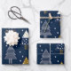 This design features an elegant navy blue background contrasting with a repeating pattern of abstract pine trees The trees utilize a mix of stunning textures: Shimmering faux gold glitter,Crisp white line art,White polka dots,Geometric vertical stripes